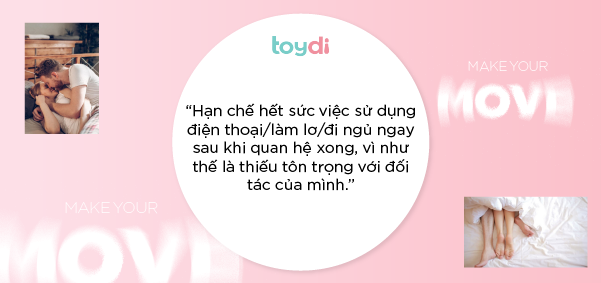 - Vệ sinh cơ thể sạch sẽ xong thì đơn giản là nằm ôm nhau, úp thìa,... và tâm tình nhẹ nhàng, hay thậm chí chỉ cần ôm nhau là đủ. Hạn chế hết sức việc sử dụng điện thoại/làm lơ/đi ngủ ngay sau khi quan hệ xong, vì như thế là thiếu tôn trọng với đối tác của mình.